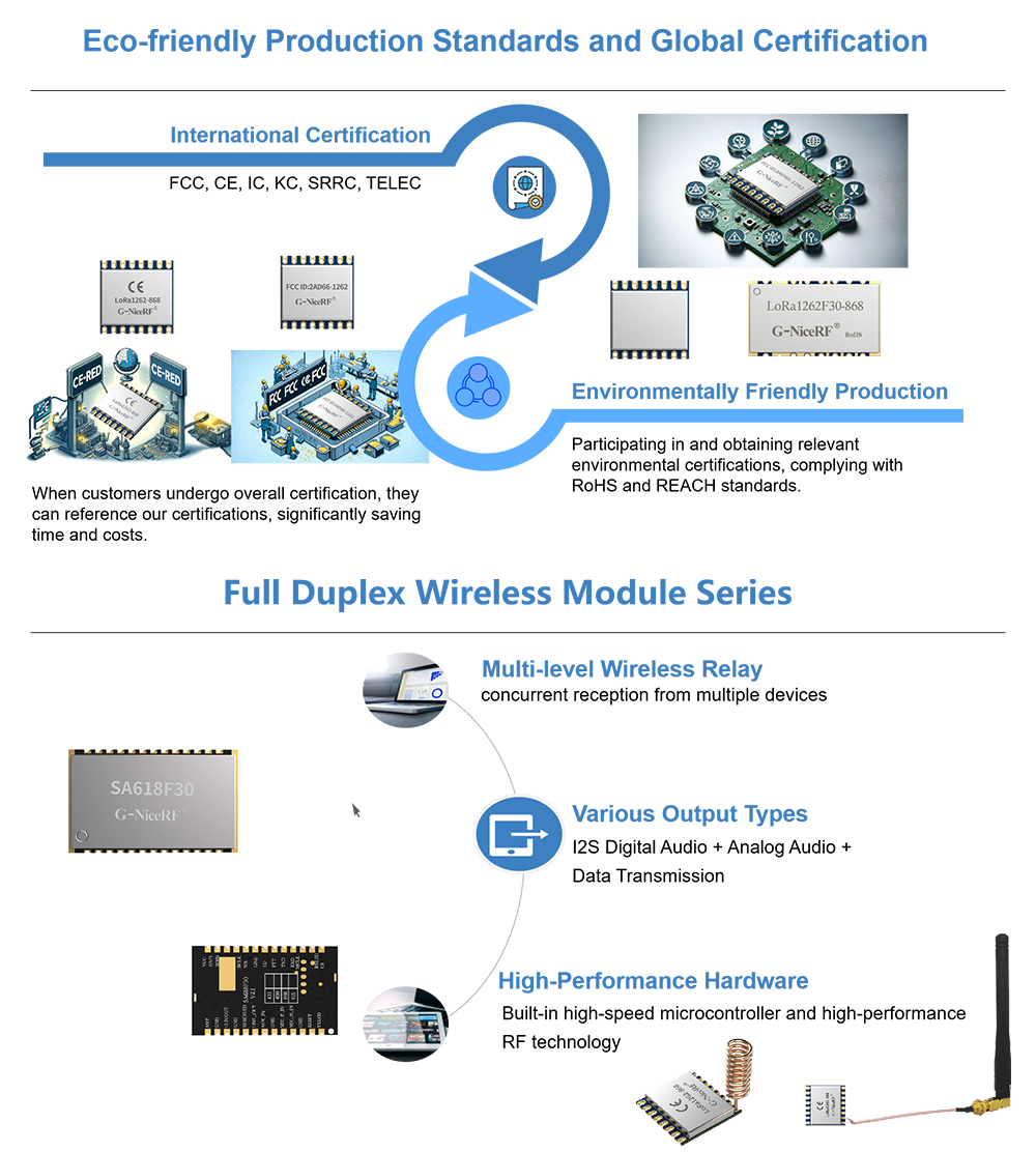 NiceRF, established in 2011, is an innovative enterprise dedicated to Internet of Things (IoT) communication applications. We integrate research, development, production, and sales, focusing on providing industry clients with high-performance wireless modules and customized product designs. We have been honored with the titles of 'National High-Tech Enterprise' and 'Specialized, Refined, Distinctive, Innovative (SRDI) Enterprise' of Guangdong Province.