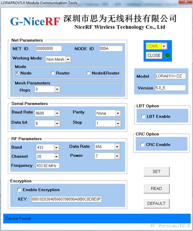 After the module is properly connected, it enters a state of 'configurable parameters'. Users can modify the module's related parameters through the PC interface, such as: operating frequency band, transmission and reception channels, air communication rate, transmission power; serial port baud rate, data bits, stop bits, parity bits; NET ID, NODE ID, key, etc. Then, by clicking the【SET】button, the module can be configured. After each successful parameter change, a 'OK' message will be sent back. The PC software should display a success prompt dialog box upon receiving the OK response; otherwise, it will display 'ERROR', indicating an operation error in a dialog box. If there is no response within 0.5 seconds after the PC sends a command, a communication error is assumed to have occurred, and an operation error dialog box should be displayed. The parameters set in this manner are saved even after power is lost. When the user clicks the【READ】button, the module will return all the current parameter information of the module. Clicking the 【DEFAULT】button, will reset the module's parameters to factory default values.